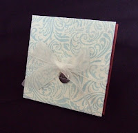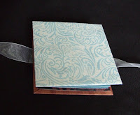 I used CTMH’s new Sarsaparilla paper pack for the front and back cover. (I just cut some chipboard and covered it with the B&T.) I used a sheet of Twilight cardstock for the body of the album instead of just using the photo paper like they suggest in the magazine. I wanted to have photos on the front and the back and the photo paper just wasn’t working. Then I added some white organdy ribbon and a charm from the Connections Club Rewards. Once I figured out what I was doing, I was able to create the second one rather quickly. Hopefully my Mom and MIL will like them.