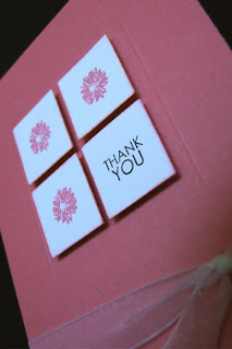 I just can’t stop making cards with the May SOTM. I just love that set! This one is a super simple card. I used the tiny flower from the new Happiness set and the Thank You from the May SOTM called Say it with Style. I embossed a square on the Hollyhock cardstock with the scoring blade on my paper trimmer. I stamped the flower and sentiment on 1″ squares and sponged a bit of Hollyhock ink around them before using 3-D foam squares to add them to the card. I added a little white organdy ribbon and was done in a just few minutes. I may make a bunch of them in different colors and put them in a box for a teacher gift. (Sorry the photos aren’t very good.)
