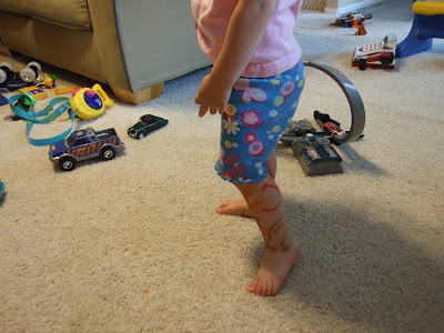 I just have to share what happened while I was gone. I called home every night to check on the kids (and my hubby.) The first night I called my hubby said, “I just took the best pictures for you to scrapbook.” Intrigued, I asked, “What are these great pictures of my dear?” He then proceeded to tell me that my daughter got a hold of my son’s markers and colored all over her legs. I have no idea where hubby was during all of this, but I was glad that I trained him well enough to take photos before he gave her a bath.