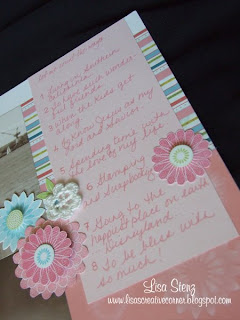 There are only a few days left to get your Tickled Pink Kit! You have until May 31st to get your kit. Below is another layout that I made using the kit. (Sorry about the horrible photos.) The layout is about some of the things that make me happy! One of the things I love about this kit is that everything is included, even the layout ideas and instructions! (That makes me happy!)