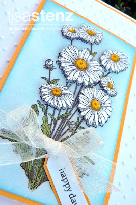 Really pretty card, Lisa. The gold layers really set off the daisies well, as does the swiss dots texture and the sheer ribbon & bow. Beautiful blue sponging, too.