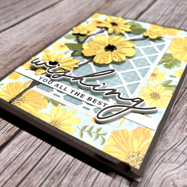 After attaching the die cut flowers and leaves, I attached a piece of White cardstock to a Foam Adhesive Sheet and then die cut the entire thing with the “wishing” outline die. Then I attached a piece of Early Espresso cardstock to an Adhesive Sheet and then die cut the thin word. This made it easy to adhere the die cut to the outline piece. (Tip: be mindful of the tiny dots over the “i”s so you don’t lose them. 😉) I also added some Fine Tip Glue to the centers of the flowers to give them a little shine.