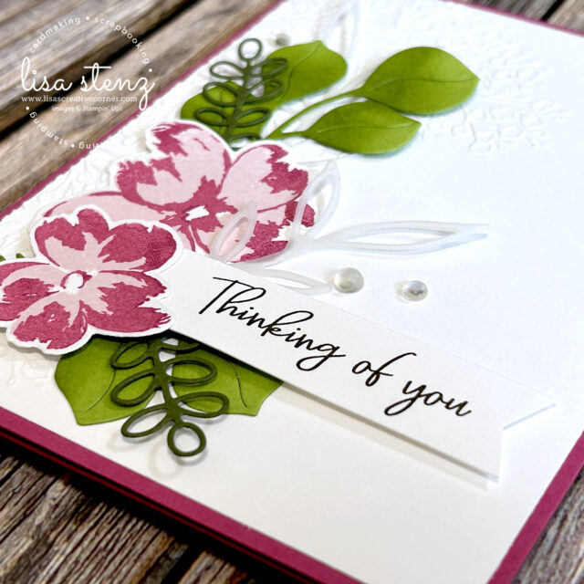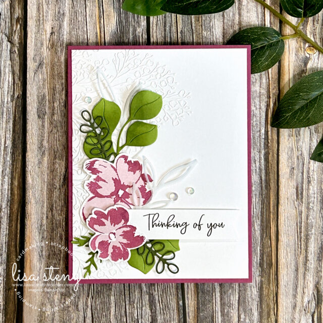 To create soft texture, I used the Pressed Flower Embossing Folder in the background, which adds a subtle, elegant touch without overwhelming the design. I also die cut a few delicate sprigs from the new Vellum. (I’m so happy that SU! is bringing back vellum!) It cuts beautifully and adds just the right amount of airy dimension.