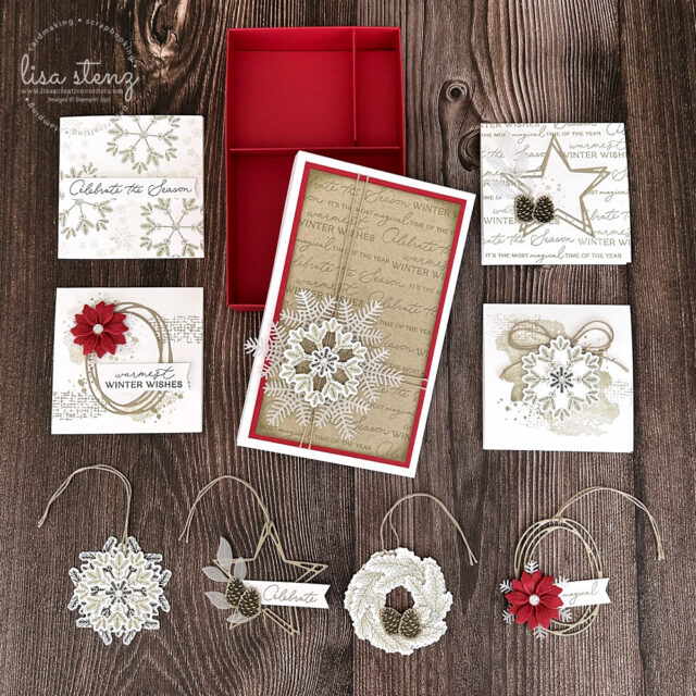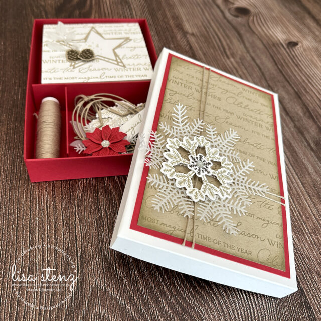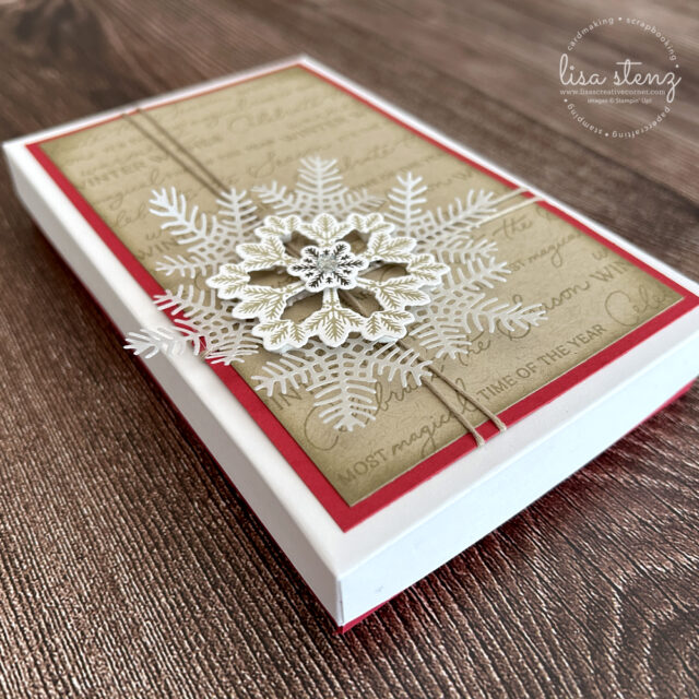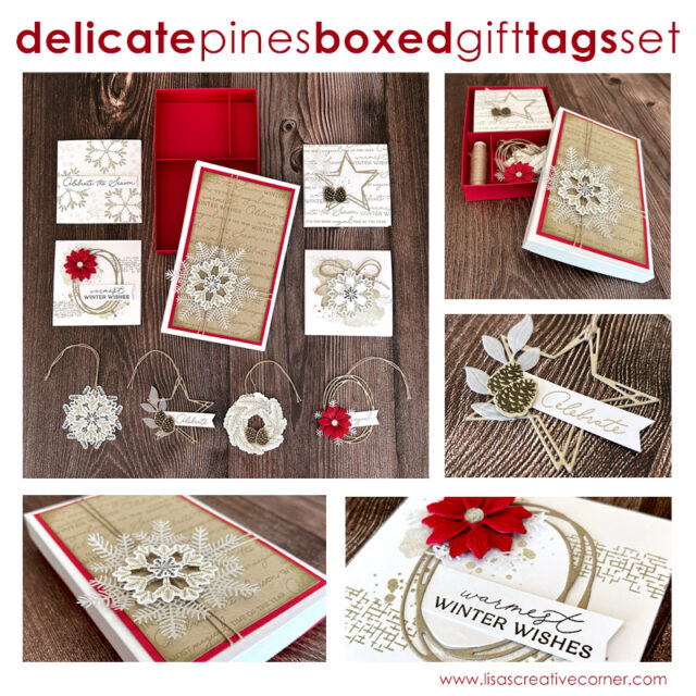 This month’s project is a set of (4) mini gift cards, (4) gift tags, and a coordinating box using Stampin’ Up’s Delicate Pines stamp & die bundle, the new Swirled Designs stamp & die bundle, and Stampin’ Up!’s beautiful new vellum. You will create a box to store your tags and because the inside sections are removable, you can also use it as a gift box. You can order all of the supplies needed to make the project using the links at the bottom of this post.