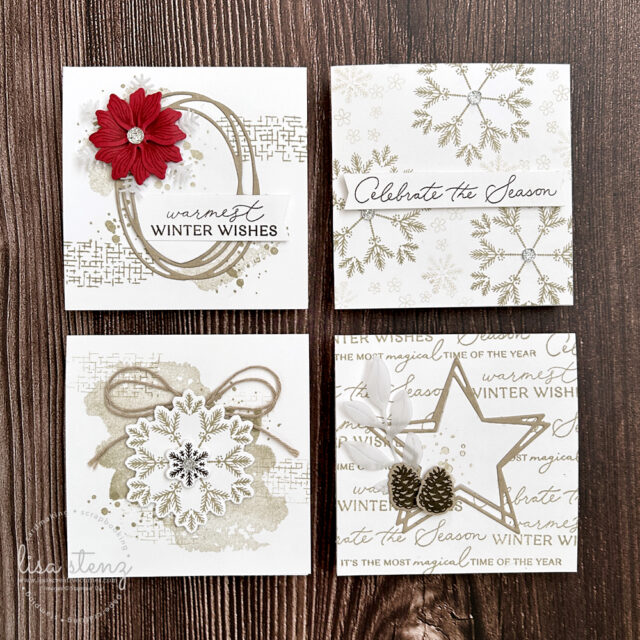 You will create (4) 3½” x 3½” gift cards using various elements from the Delicate Pines and Swirled Designs bundles!