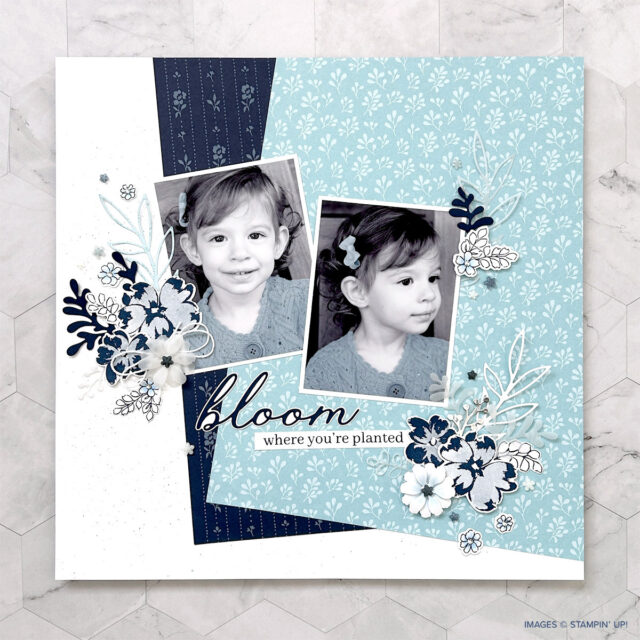 Today I’m sharing a 12″ x 12″ scrapbook layout that I created using the December Product of the Month – True Blue Florals Designer Series Paper. This beautiful paper collection was the perfect choice for documenting these cute photos of my daughter. (Even though she’s 19 years old now, I love that these photos remind me of her sweet innocence when she was little.)