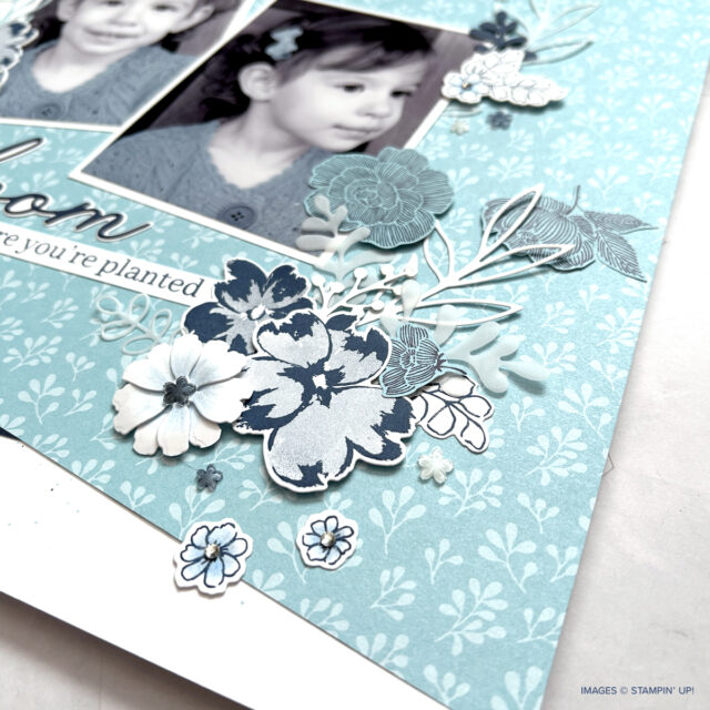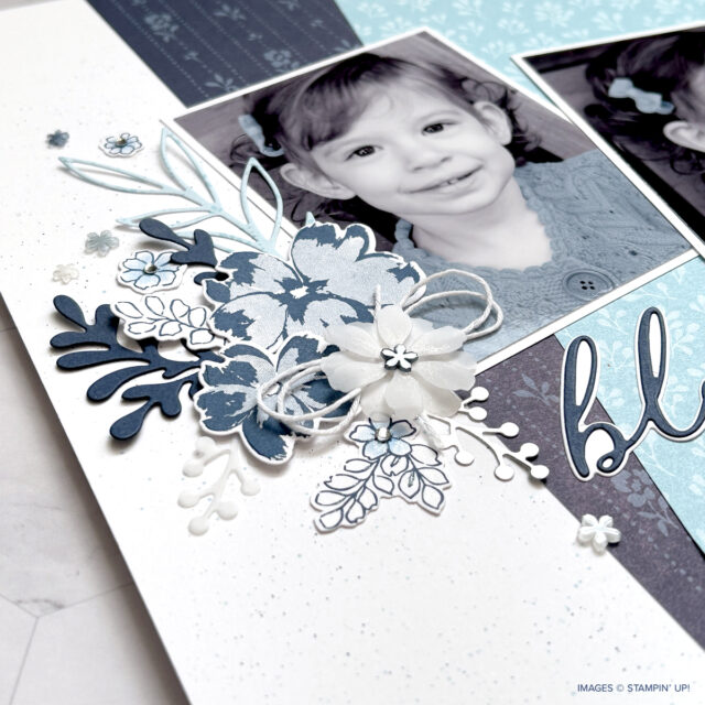 For this layout, I started out by adding some light flecks of color to the white cardstock by tapping the Balmy Blue and Night of Navy Blends markers over the cardstock. I then layered two different designs from the True Blue Florals DSP onto the white background to create the foundation of the layout. I built a few clusters of leaves and blossoms around the photos to coordinate with the floral patterns from the DSP. I mixed die cuts, stamped images, and a few dimensional flowers to give the page depth and a touch of whimsy. See full supply list below.