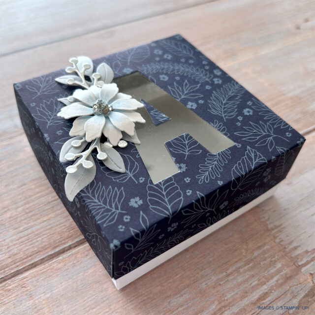 For this box, I paired the True Blue Florals Designer Series Paper with the Party Alphabet Dies to create a personalized monogram on the front. This paper is absolutely beautiful, and I love how easy it is to mix and match the patterns for different looks.