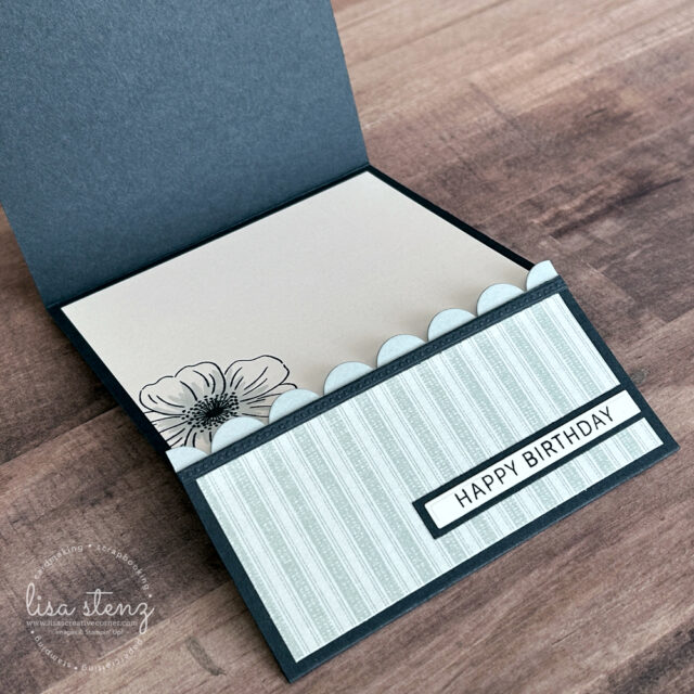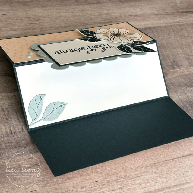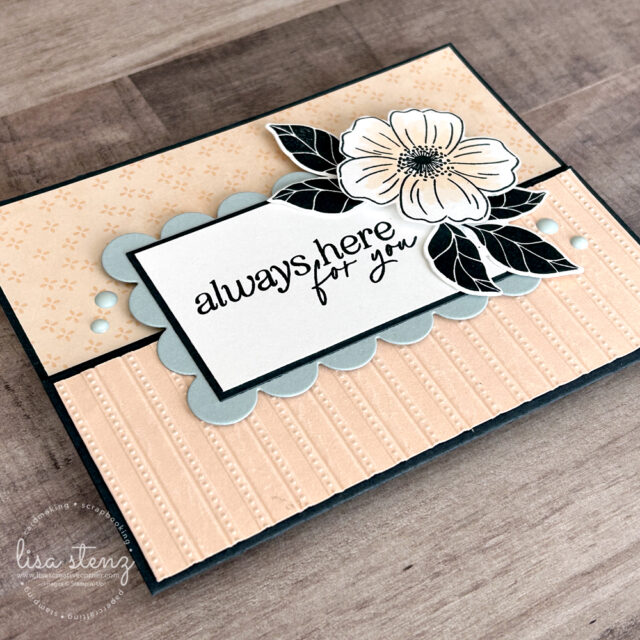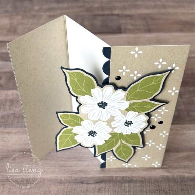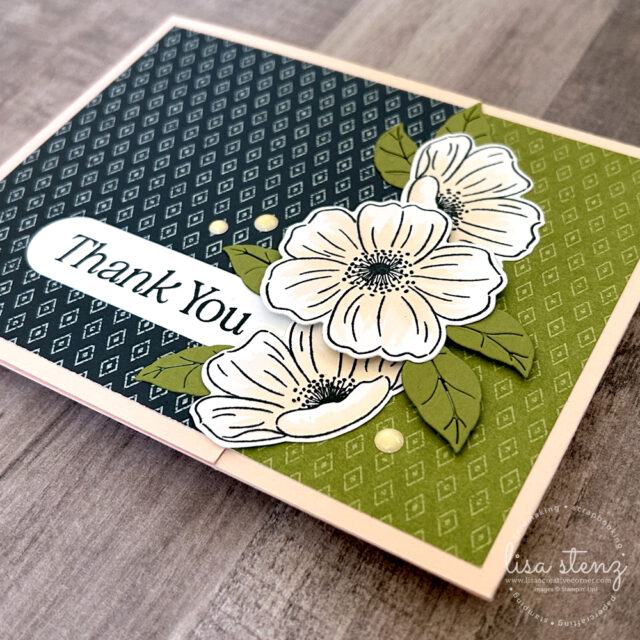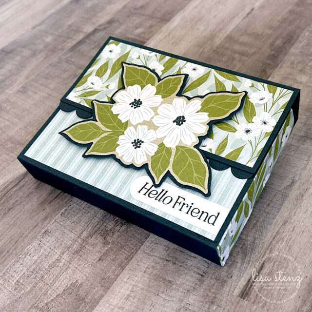 This month’s project is a set of (5) A2 sized hinge cards and a box to store them using Stampin’ Up’s Lovely Blossoms Suite Collection. The hinge design lets decorative elements hang over the edge, giving each card a unique look and a fun, interactive way to open them. You can order all of the supplies needed to make the project using the links at the bottom of this post.*