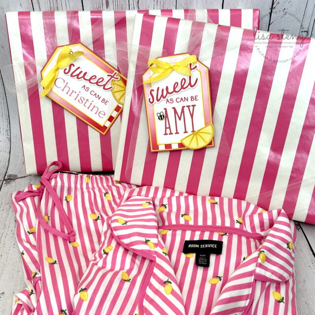 When I found these adorable (and incredibly soft!) pajamas with pink stripes and little lemons, I immediately thought of the Made with Sweetness stamp and die bundle. The colors and theme were just perfect, so I created custom tags to go along with each gift.
