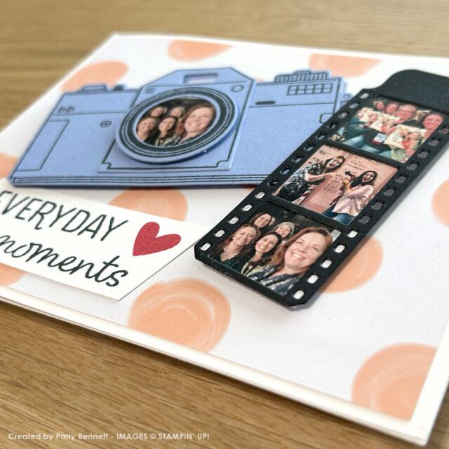 Patty used the Capturing Smiles stamp & die bundle to create the camera and film strip. She added photos to the lens and film frames, turning them into the perfect way to capture and share our OnStage memories.
