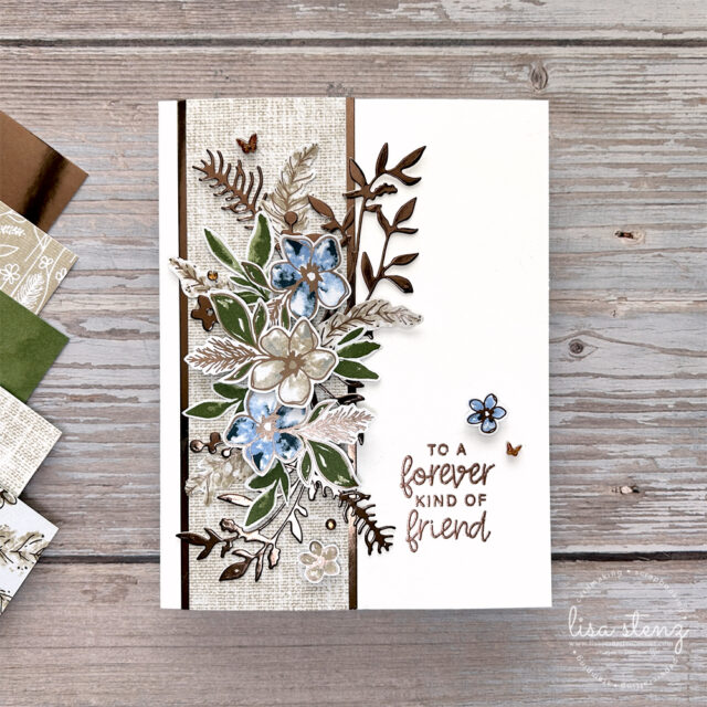 For the focal point, I fussy cut several flowers and leaves directly from the DSP to create a layered, dimensional look. This fussy cut card technique adds depth and detail without a lot of extra supplies. I paired those with additional die cut leaves and stems using the Delicate Whispers Dies and the gorgeous Earthen Toned Metallic Specialty Paper. The mix of textures, layers, and metallic shine really brings the elegant handmade card design to life.