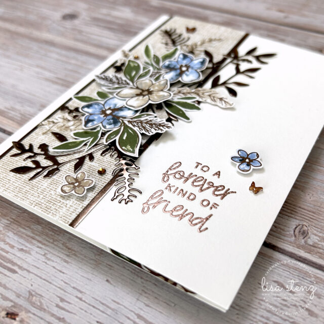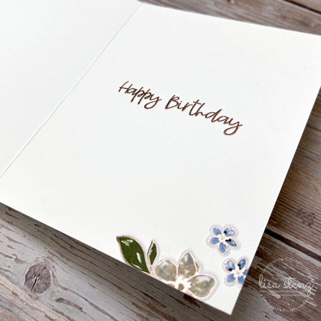 The sentiments on both the front and inside of the card were stamped in Versamark ink and heat embossed with Bronze embossing powder for a rich, polished finish. This heat embossing technique adds a beautiful shine and texture that complements the metallic elements on the card. The sentiments are from the new Lily of the Valley stamp set, available beginning May 5 in the new Stampin’ Up! catalog.