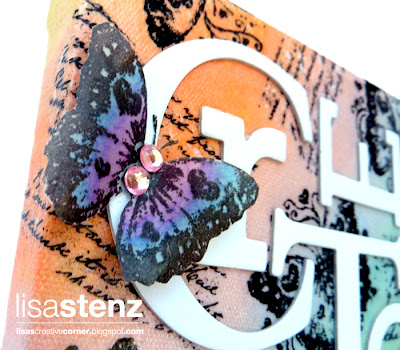 Then I braved the dreaded Mod Podge (which I have a love/hate relationship with) and painted it onto the canvas. While it was still wet, I layered my torn stamped tissue images onto the Canvas and added more Mod Podge on top. While that was drying, I stamped the butterfly image onto a piece of vellum with some black pigment ink and then sprinkled some Clear Detailed Embossing Powder on top. I carefully heat set it with my Craft Heater and then colored it in with some CTMH Alcohol Markers, which work great on the vellum. After cutting out the butterfly, I rolled the wings a bit so that it had some dimension and then set it aside.