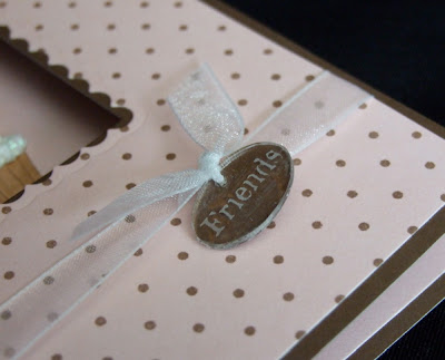 I finally put together a few more stamps that I got during SU!’s Sale-a-bration promo a few months back. This card uses their cute cupcake from Cause for Celebration. I also used Papertrey’s Polka Dot Basics set for the Chocolate dots and my rectangle Nesties to make the cutout on the Baby Pink and Chocolate (CTMH) cardstock. I used Liquid Appliqué for the frosting and sprinkled on a bit of CTMH Prisma Glitter. For the final touch I added some CTMH White Daisy Organdy Ribbon with a CTMH Friendship Dangle backed with Chocolate cardstock. The card isn’t exactly what I had envisioned, but I guess it came out ok.