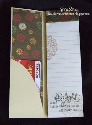 Nichole sells note pads that are the perfect size for making cute little list pads, but I decided to try to make one on my own. I bought a pack of two notepads at Staples that were perfect. They were 5″x8″ eco-friendly writing pads. (To be honest, the main reason I bought them was because they had brown lines that I knew would match my project.) I cut them in half with an xacto blade and made a folder out of CTMH Bamboo cardstock. I followed Nichole’s example and made a rounded pocket on the inside where I put the gift card.