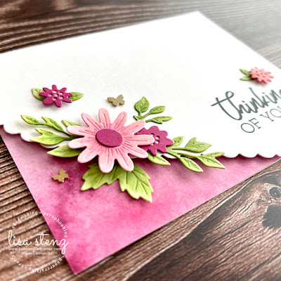 This dimensional card was created using one of the online exclusive dies called Around the Bend. It is a fantastic set because it contains multiple dies to create all kinds of  fun edges on your cards in addition to sweet flowers and leaves. The sentiment is from a stamp set called Friends for Life and the Designer Series Paper in the lower left corner is from the Full of Life collection. I LOVE this collection because it is so fun and colorful. You can also order the suite which includes both of these products at a discount here.